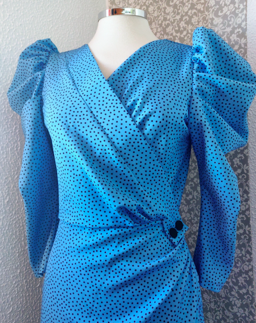 Sus mangas son abullonadas y su escote es cruzado con detalle de un par de botones en la cintura.