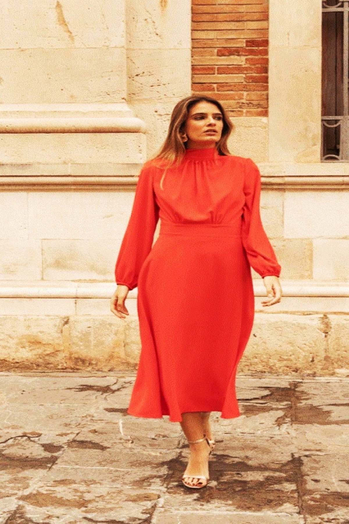 Vestido midi en tejido fluido de poliéster.