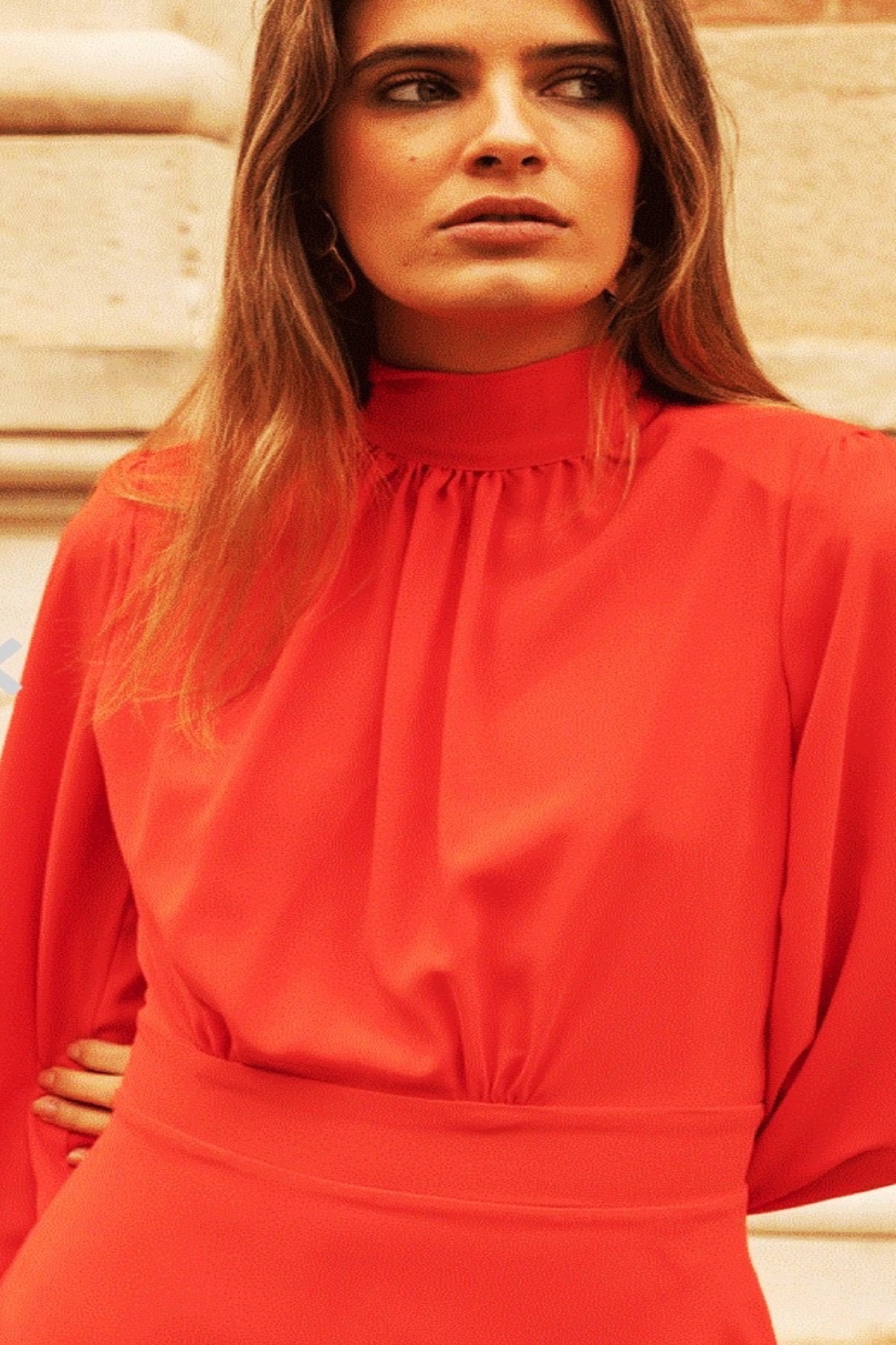Cuello alto con fruncido delantero y cierre de lazada.